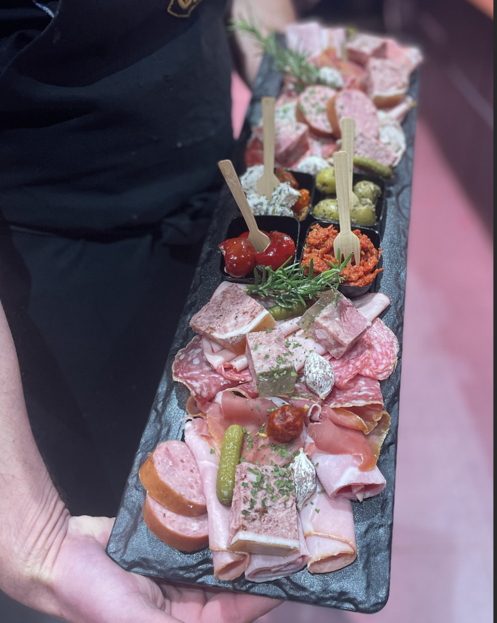 Plateau de 4 personnes composé de:Jambon blanc, jambon de pays, rosette, salami, salamai poivre, chorizo, andouille, mortadelle, saucisson à l'ail, apérisec, terrines maison, cornichons.