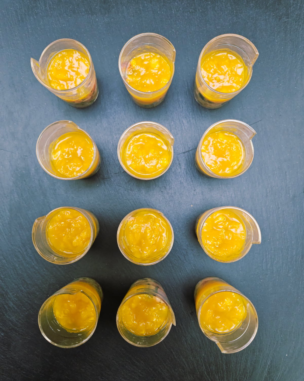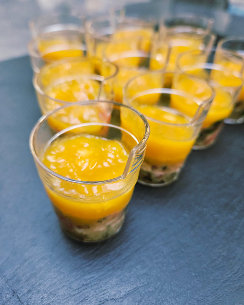 * Verrine Duo de Gambas et Mangue: Verrine composé d'une couche de Mangue cuisinée, déposée sur un tartare de gambas dés de tomate et dés de concombre, parfumé de basilic et menthe.