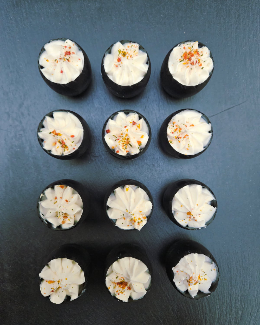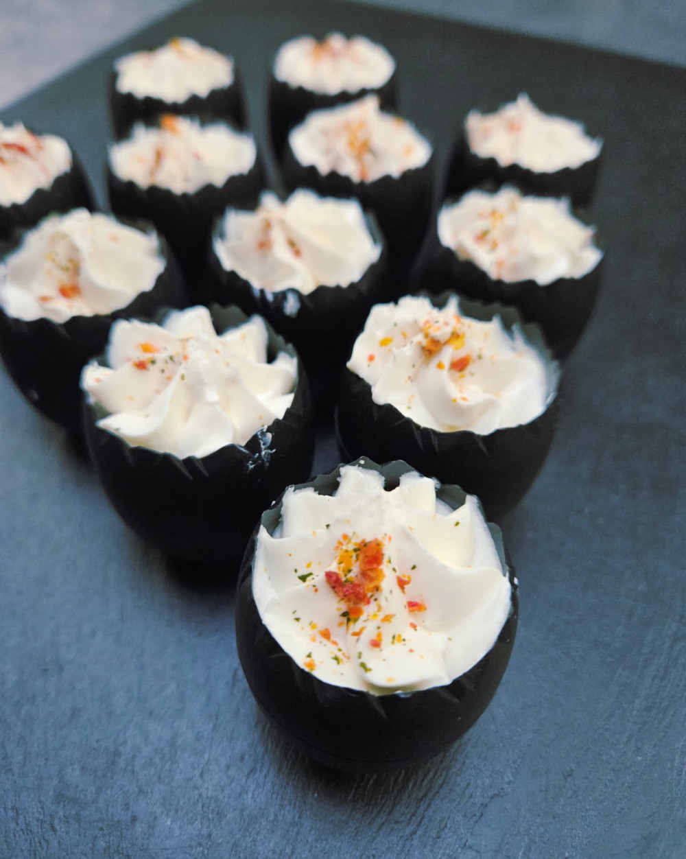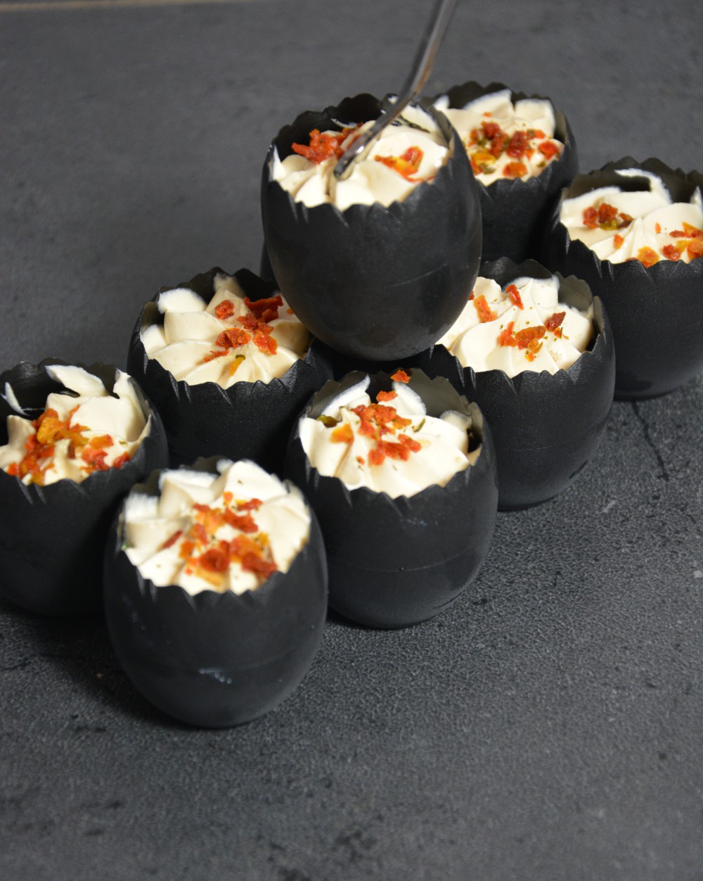 * Plateau de 6 pièces: Mise en bouche alliant le saumon fumé, brisures de truffes noires, le tout orné d'une préparation à base de sauce au fromage frais aromatisée à la truffe.