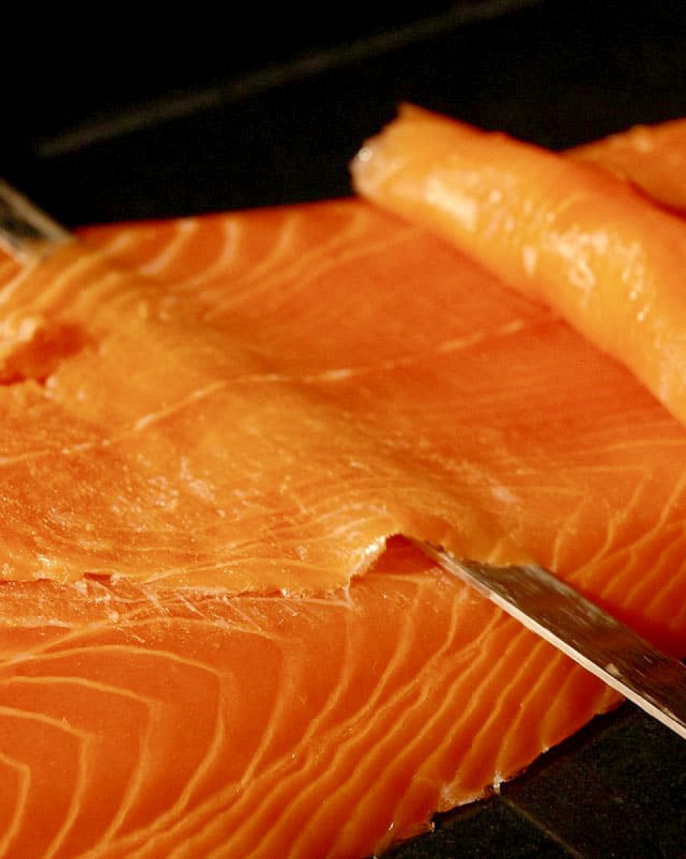 Véritable saumon fumé norvégien tranché main, tranches larges.