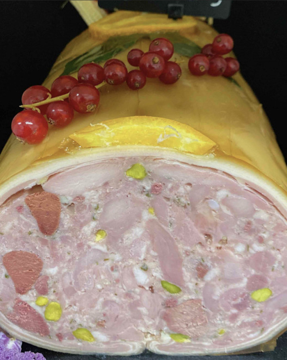 Porcelet farci à la viande de porcelet, et foie de poulet confit.