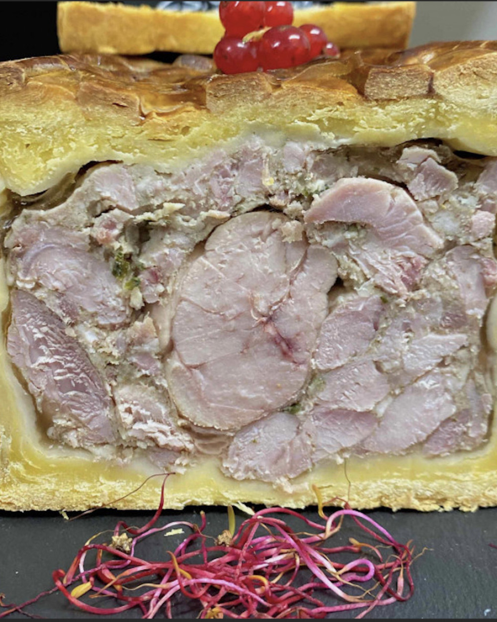 Véritable pâté en croûte avec marquants de jambon et maigres de veau, le tout parfumé au vin blanc.